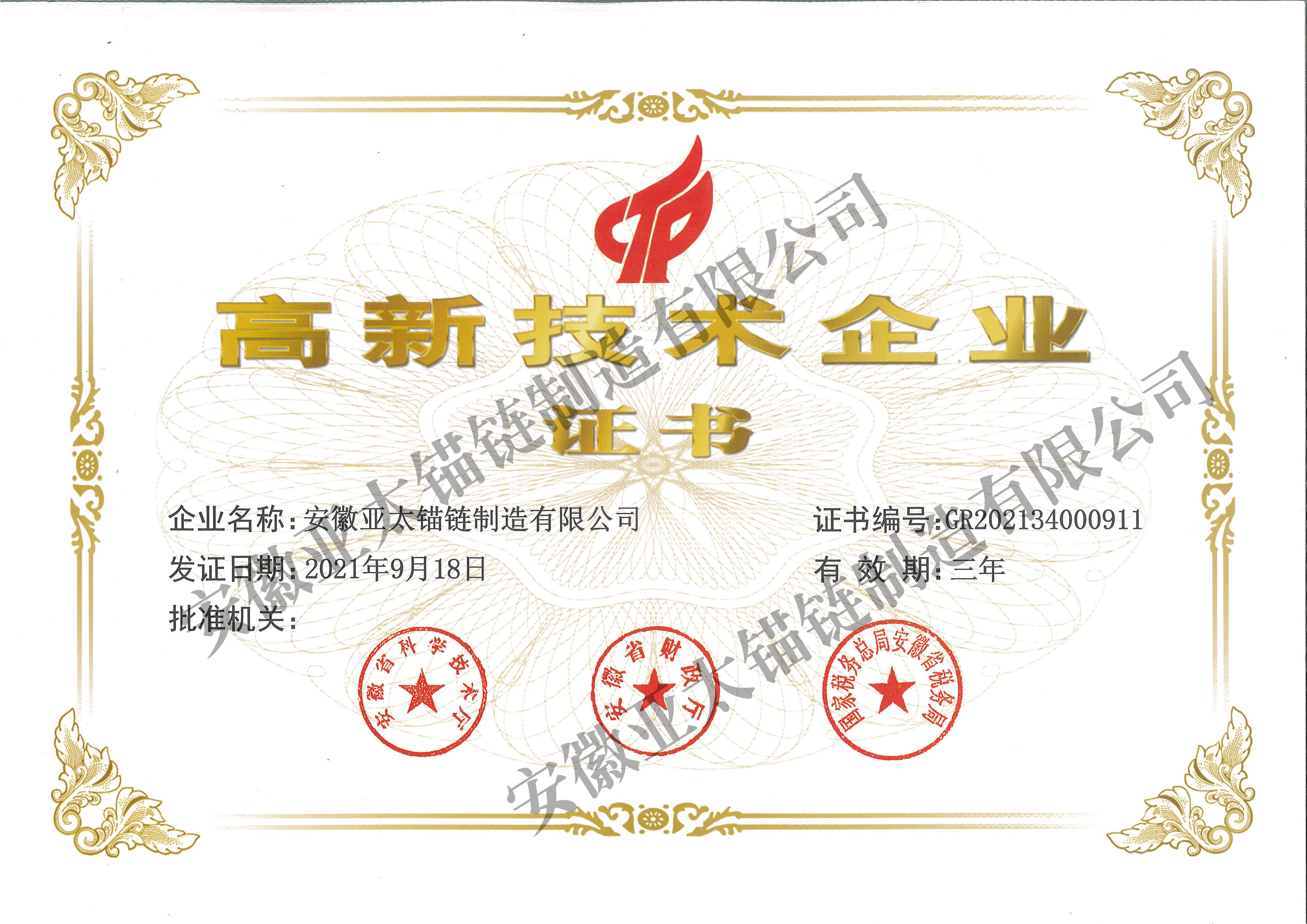 安徽亞太錨鏈制造有限公司是國家高新技術企業,也是國家GB/T 549-2017《電焊錨鏈》標準的起草和制定單位之一。公司旗下設有錨鏈分廠、浮標分廠、舾裝件分廠等多個分廠。公司專業從事φ12.5mm-φ107mm二、三級船用錨鏈、浮標錨鏈、錨鏈附件,錨、船舶曬裝產品、航標、系船浮、船型標、多種規格海洋監測浮標及航標燈等產品的生產、安裝和服務。目前公司的產品銷往全國各地船廠、碼頭、航標處、航道局、海洋局,并已走上國際市場,如東南亞、中東、歐美等國家。